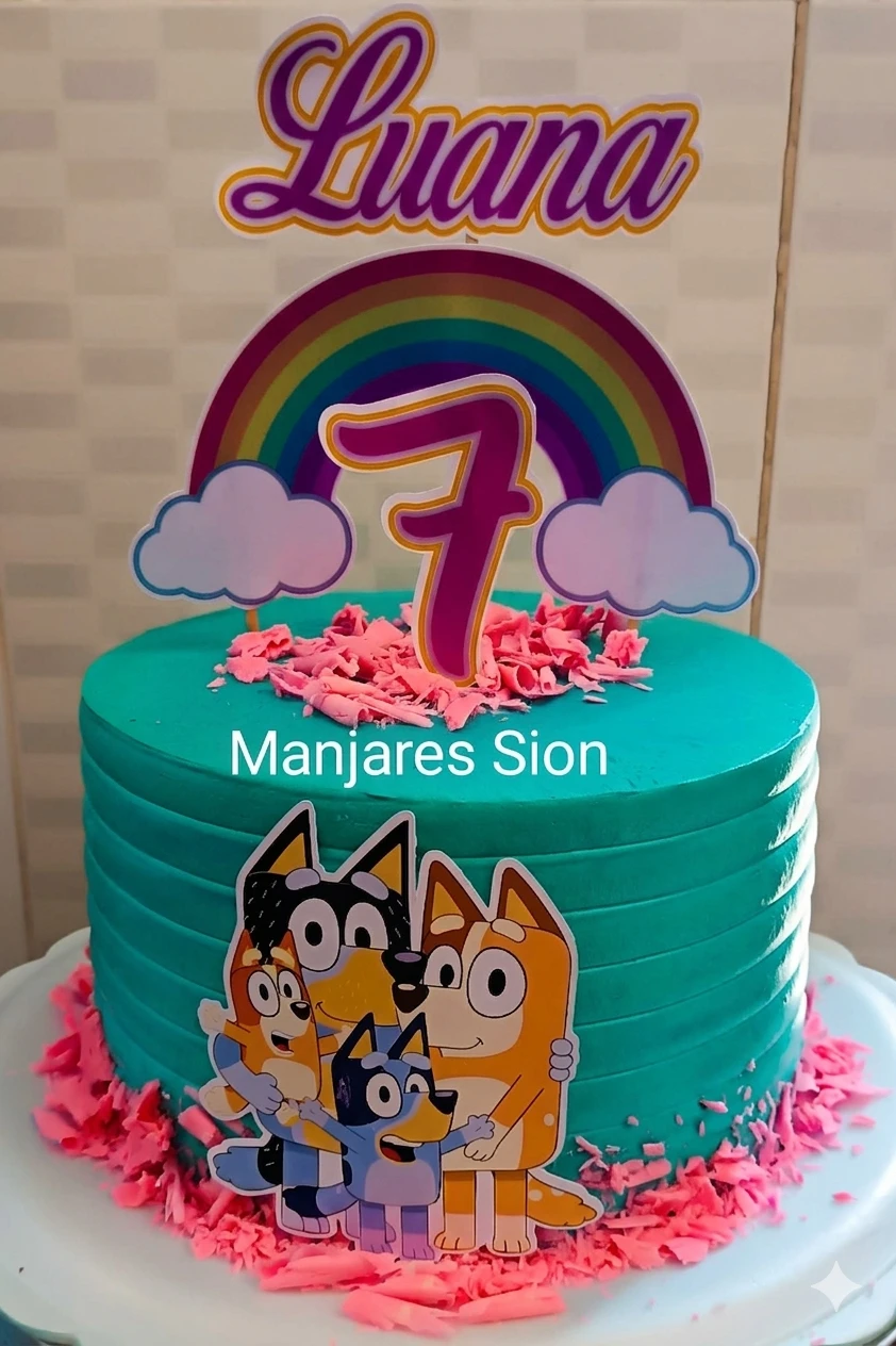 Título: Pastel Temático Bluey & Familia Dale un toque mágico a tu evento con nuestra creación exclusiva de Bluey. Este pastel cuenta con un acabado impecable en tonos turquesa, decorado con virutas rosas y toppers personalizados de alta calidad.